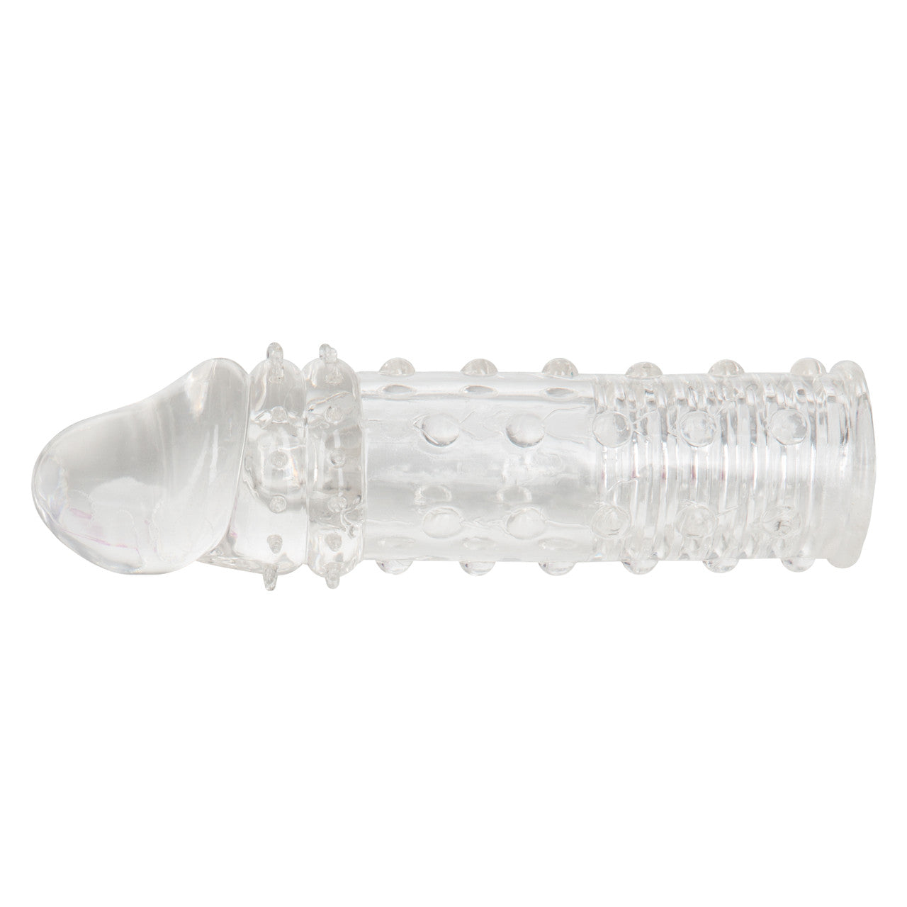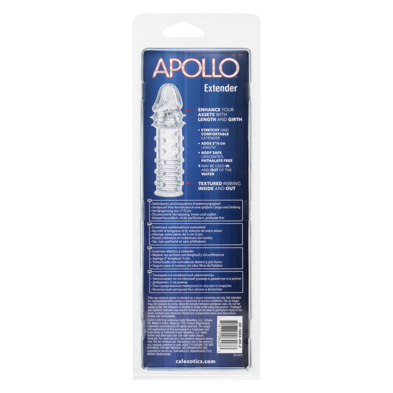 Apollo Extender Clear Penis Extension. Stretchy and comfortable, the Apollo Extender adds 2 inches to an erect length. Designed to increase the natural length, girth and at the same time add stimulating texture, the penis extender has an attractive, pleasure enhancing design that is sure to satisfy. Textured ribbing inside and out will please both you and your partner, adding extra zing to any encounter. This penis extender is completelytranslucent, allowing sexy visibility along with thrilling enhancement. Along with increasing both length and girth, the extender improves stamina so that you can stay harder longer and stronger. Crafted from a completely safe, phthalate free, Thermoplastic Rubber TPR material, the extender is as safe as it is satiating. Thoroughly compatible with Water Based personal lubricants and Silicone based personal lubricants, the Extender stimulates and supports, created for the ultimate in comfort and an exciting, sensual experience. With sleek styling and a comfortable fit, this extender offers everything you need to get exactly what you want. So get ready, get set, and get ready to enjoy an extended sexual adventure that will have you both craving more. Stretchy and comfortable extender. Adds 2 inches to length. Textured ribbing inside and out. Discreetly enhances both length and girth. Safe and pure for body and pleasure made using phthalate free materials Thermoplastic Rubber