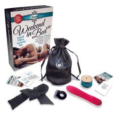 Behind Closed Doors Weekend In Bed IV Good Vibes 7 Piece Set from Little Genie Productions. Weekend in Bed IV, Good Vibes LITBCD020. Weekend in Bed Good Vibes Activity Kit is everything you need for an electrifying weekend of fun. This seven piece set includes a Silicone Bullet Vibrator, a Vibrating Cock Ring, Massage Candle, Satin Tie or Blindfold 2 decks of activity cards in a convenient travel bag. Electrify your love life with Good Vibes. Explore new activities incorporating these vibrating sex toys. Entice your lover with a sensual rub down using the massage candle to sooth and relax before more daring adventures. Use the Satin tie to blindfold or bind, to intensify the senses and arouse anticipation. This kit allows you and your partner to experience the delights of adding a little charge to love making. Take a rousing journey and explore all that added vibes can do. Weekend In Bed 4, Good Vibes also includes 2 sets of cards to inspire you to become more creative with your lover. Materials Satin blindfold, Silicone Vibrator. Vibrating cock ring requires 2 AG13/LR44 inside ring, included. Vibrator requires 2 AAA batteries, not included. Categories: Party, Games, Supplies, X-Rated Adult Games, Xmas items, Sensual Kits, Holiday Items, Valentine's Day Item, Valentine's Day falls on a Wednesday February 14, 2024. 2024.
