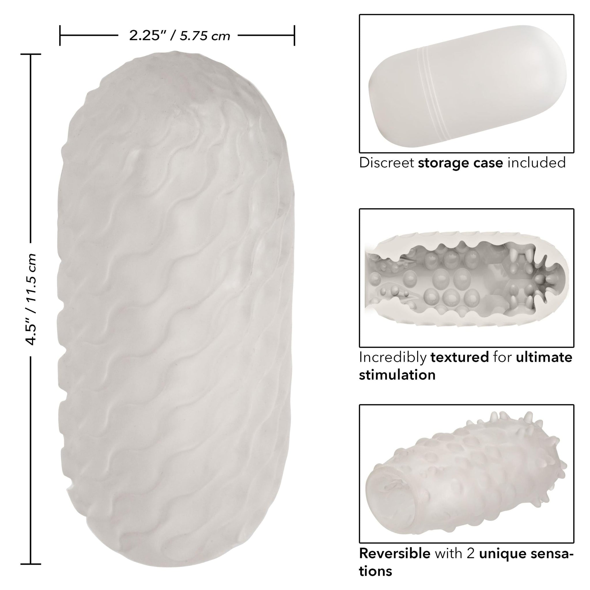 Features: Phthalate free. Waterproof. 1 year warranty. Measurements: 4.5 inches by 3 inches. Bulk weight 10.2 ounces. Package 11.5 ounces. Package: 2.75 inches by 4 inches by 8.25 inches. Categories: Solo Masturbators, Sex Toys for Men, Male Masturbators, Masturbation Sleeves. 2023.