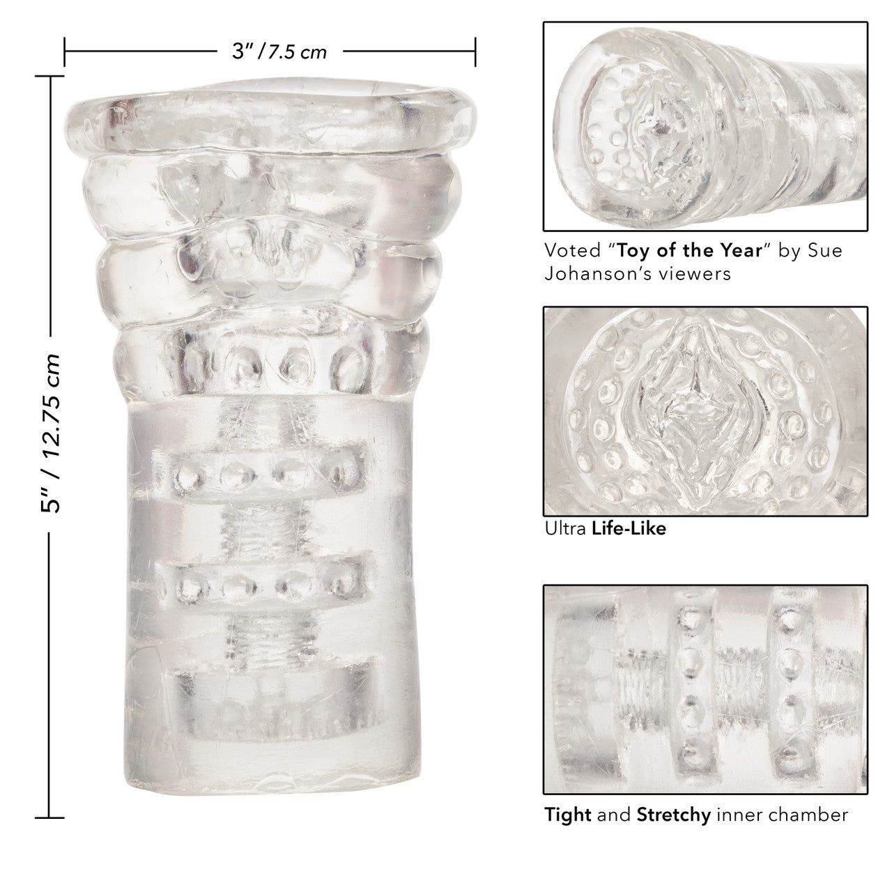 (NON-RETAIL, BULK PACKAGING) Sue Johanson Head Honcho comes without retail packaging bulk. Voted Toy of the Year by Sue Johanson's viewers. Sue Johanson's Head Honcho This super stretchy, translucent Silicone 5 inches long toy fits perfectly in the palm of your hand. The ribbed head provides better grip and prevents slippage. The entrance and interior tip both have raised nodules to increase stimulation on the head and base of the penis. The best part of this toy is the three extremely tight suction chambers. These three rings, each a half-inch apart, contain their own set of nodules that massage and create positive friction along the shaft! Safe and pure for body and pleasure. Made using phthalate free, non-toxic materials Senso Thermoplastic Rubber TPR. A water based lubricant is recommended. Hand held male masturbation device measures 5 inches long by 3 inches wide. Bulk weight 6.5 ounces. Always clean before and after use. Categories: Male Masturbators, Sleeves, Rings, Solo Masturbators, Sex Toys for Men. 2023.