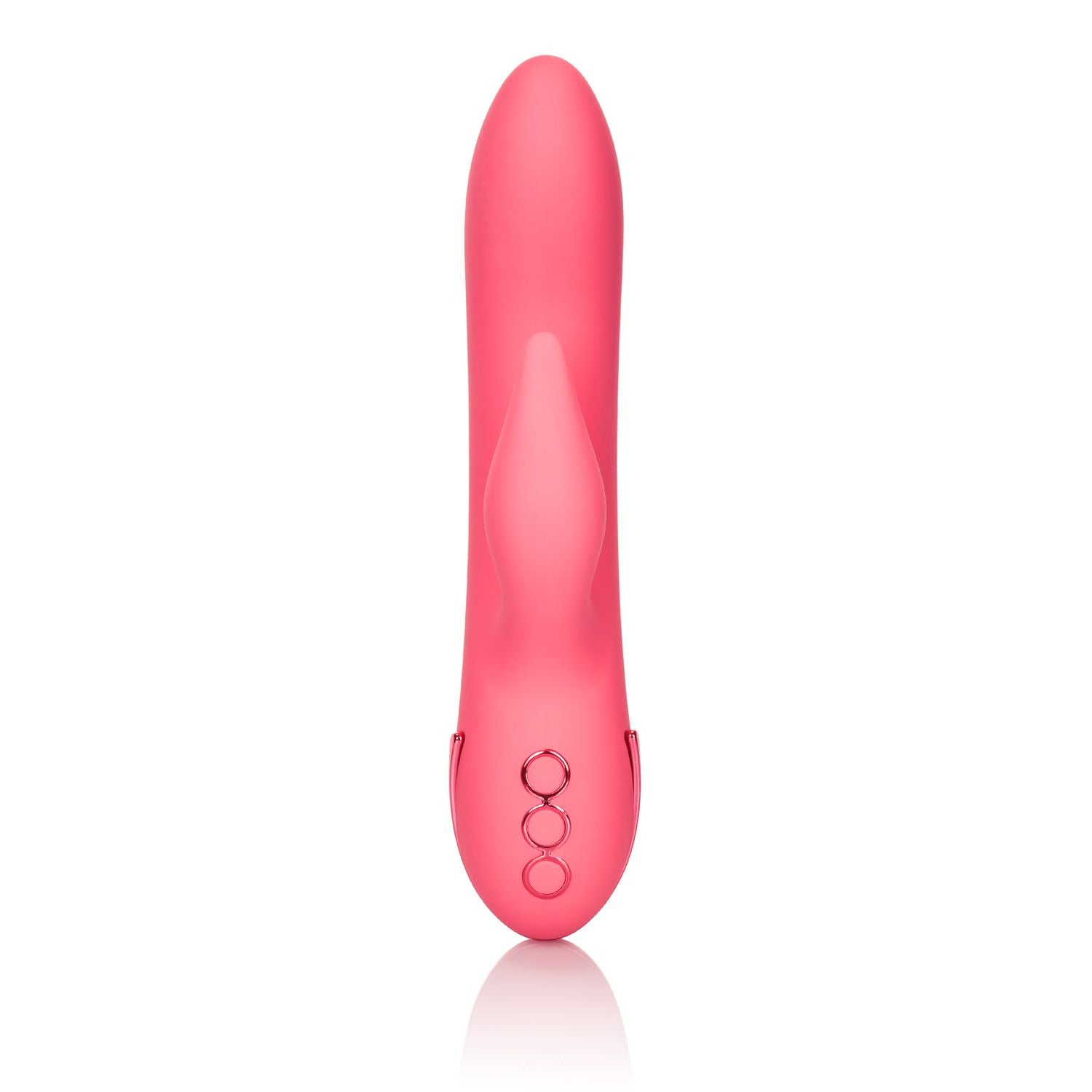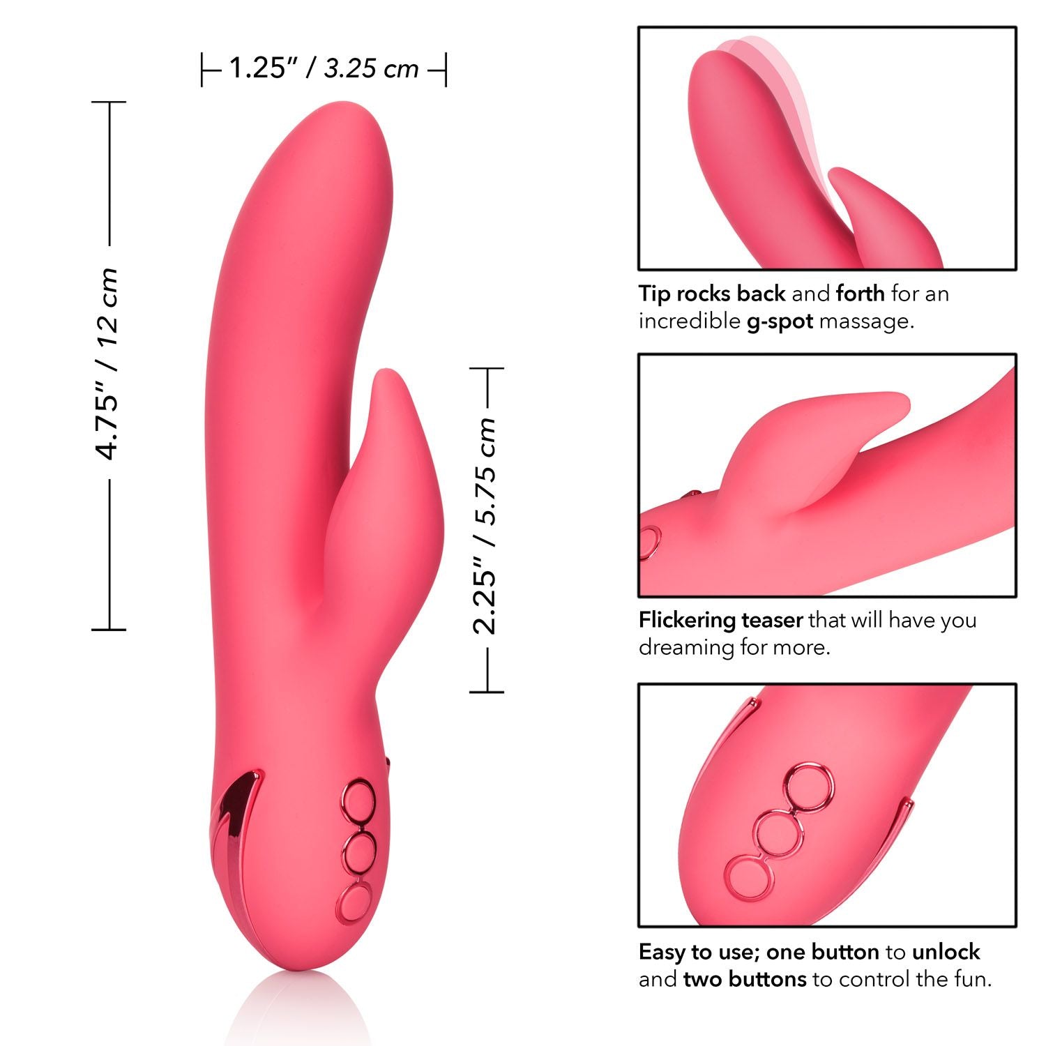 California Dreaming San Francisco Sweetheart Pink Rabbit Style Vibrator. Dive deep into pools of pleasure and sun kissed fantasies with the playful California Dreaming San Francisco Sweetheart. The luxurious vibrating massager has 10 intense vibration functions and 3 back and forth G-spot massager speeds for one of a kind pleasure experience. The seamless silicone body and flickering teaser put out knee shaking stimulation in and out of the water. Whether you are looking to turn up the heat with a lover or just enjoy some sensual solo time, this ravishing rabbit is ready. While the curved tip rocks back and forth for powerful g-spot massage, the soft, flickering clitoral vibrator delivers blissful external pleasure. Control and customize your pleasure play with the independently controlled vibration massager and rocking functions. Recharge the massager in 2.5 hours with the provided USB charging cable to enjoy 45 minutes of high speed stimulation or 2.5 hours of low speed vibrations. Enjoy frustration free control with the easy touch 3 button control pad and security lock feature for travel ready teasing. The virtually seamless body and self sealing charging port allow you to get this versatile waterproof vibe for a dip. The hypoallergenic premium silicone is body safe, unscented and phthalate free to keep you most sensitive spots, happy and healthy. Color Pink. Materials Silicone, ABS Plastic with Metallic Plating. Power source USB Rechargeable included.