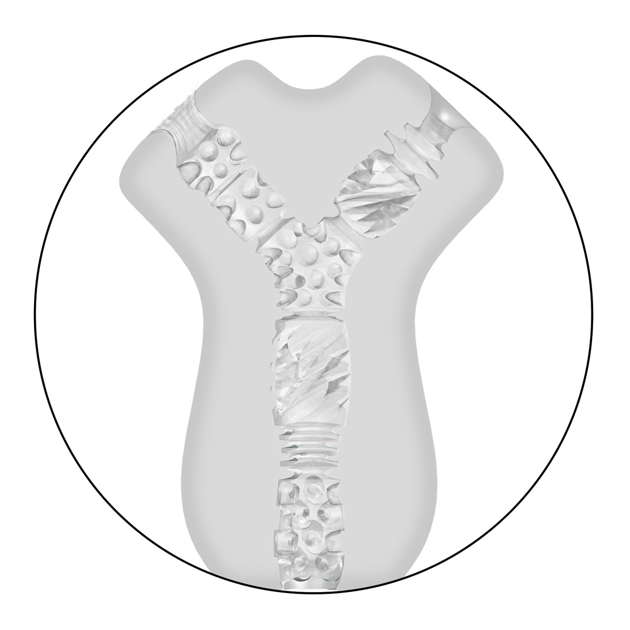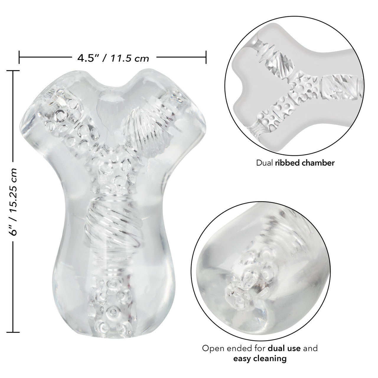 Cyclone Dual Chamber 6 inches Clear Stroker from California Exotic Novelties. Experience unparalleled pleasure with the Cyclone Dual Chamber Stroker. This premium masturbator is designed to take your pleasure to the next level with its innovative features and exceptional design. The easy grip design of the stroker ensures a comfortable and secure hold, allowing you to fully control your experience. Its dual ribbed chamber design provides intense stimulation and enhances every stroke, driving you wild with pleasure. The transparent design allows you to witness the action as you indulge in your fantasies. Crafted from soft, tight, and stretchy material, the stroker delivers a life like feel that will leave you craving more. The open ended design allows for dual use and easy cleaning. Let the Cyclone Dual Chamber Stroker transport you to a world of pleasure and satisfaction. With its multi-chambered design and exceptional functionality, this stroker is built to fulfill your desires and provide you with unforgettable sensations.