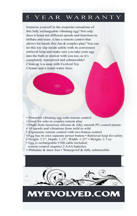 Evolved Novelties Rechargeable Egg Pink Vibrator with Remote Control. Immerse yourself in the exquisite sensations of this fully rechargeable vibrating egg! Not only does it boast ten different speeds and functions to titillate and tease, but it has got a remote control that allows for hands free fun, and couples play! You can let this toy slip inside safely with its convenient retrieval loop and make sure you take your egg into the bath or shower with you too, as it is completely waterproof and submersible! Clean up is a snap with Evolved Toy Cleaner and a warm water rinse.