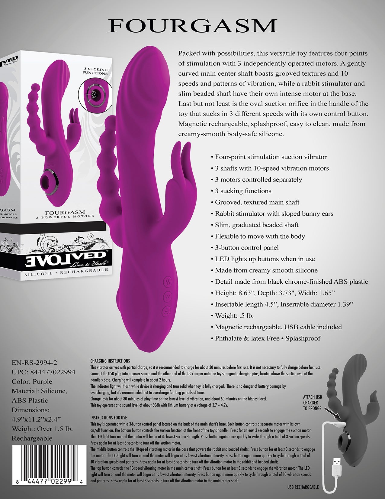 Evolved Fourgasm Rabbit Style Vibrator from Evolved Novelties. Four times the stimulation of a single Rabbit Vibrator. Packed with possibilities, this versatile sex toy features four points of stimulation with 3 independently operated motors. A gently curved main center shaft boasts grooved textures and 10 speeds and patterns of vibration, while a Rabbit stimulator and slim beaded shaft have their own intense motor at the base. Last but not least is the oval suction orifice in the handle of the toy that sucks in 3 different speeds with its own control button. Magnetic Rechargeable, splashproof, easy to clean, made from creamy smooth body safe Silicone.