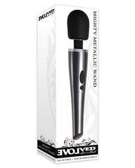 Mighty Metallic Wand Body Massager from Evolved Novelties. This sexy black metallic wand is wireless and rechargeable with 8 powerful speeds and functions that will drive you over the edge in style! The easy to use toggle button is so intuitive that you are free to concentrate on the delicious flexibility of the creamy silicone head and the intense pleasure of the mighty motor! Bring your wand into the bath or shower with you as it is completely submersible!