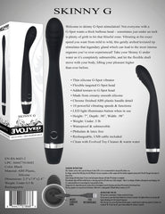 Evolved Skinny G G-Spot Vibrator Black. Welcome to Skinny G stimulation. Not everyone with a G-Spot wants a thick bulbous head. Sometime just under an inch is plenty of girth to hit that blissful zone. Vibrating at the exact speed you want from mild to wild. This gently textured tip stimulates that legendary gland which can lead to the most intense orgasms you have ever experienced. Take that Skinny G under water as it is completely submersible. Let the flexible shaft move your body and move to higher pleasure. Thin silicone G-Spot vibrator. Flexible G-Spot head. Added texture to G-Spot head. Made of creamy smooth silicone. Black chrome finished ABS plastic handle detail. 10 powerful speeds and functions. LED light eliminates button when in use. Height 7 inches, depth .98 inch by width 98 inch. Phthalate free, latex free. Waterproof and submersible. Rechagreable USB. Clean with Evolved Toy Cleaner and a warm water rinse.