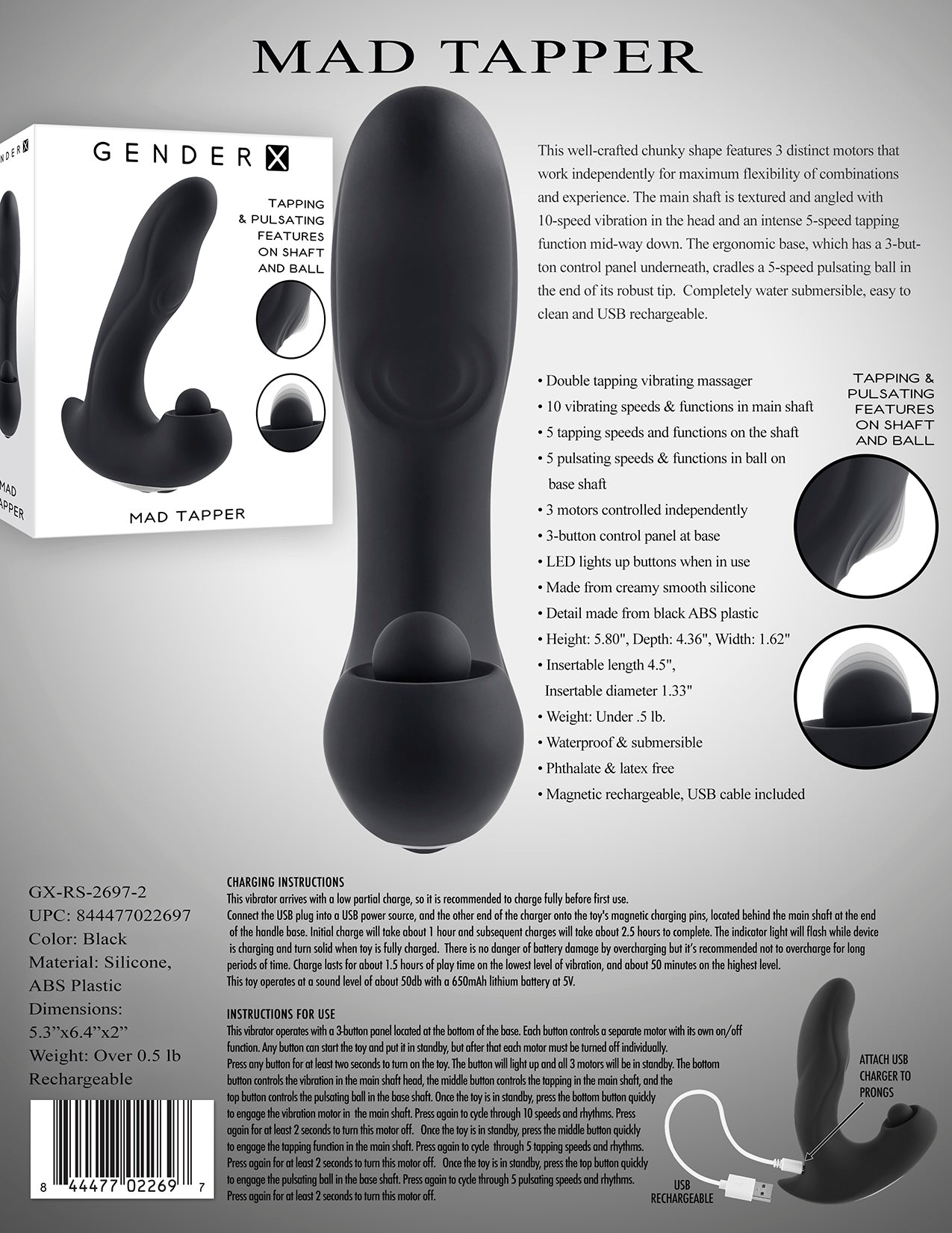 Features: double tapping vibrating massager. 10 vibrating speeds and functions in main shaft. 5 tapping speeds and functions on the shaft. 5 pulsating speeds and functions in ball on base shaft. 3 motors controlled independently. 3 button control panel at base. Light Emitting Diode LED lights up buttons when in use. Made from creamy smooth Silicone. Detail made from Black ABS Plastic. Size height 5.80 inches, depth 4.36 inches, width 1.62 inches. Insertion length 4.5 inches, insertion diameter 1.33 inches. Bulk weight under half a pound. Waterproof vibrations. Submersible for play outside the bedroom. Made with body safe materials both Phthalate free and latex free. Magnetic rechargeable, USB cable included. 5 years warranty. Categories: Anal Toys, Prostate Massagers, P-Spot Stimulators, Vibrators, Rechargeable Vibrators, G-Spot Massagers. 2023.