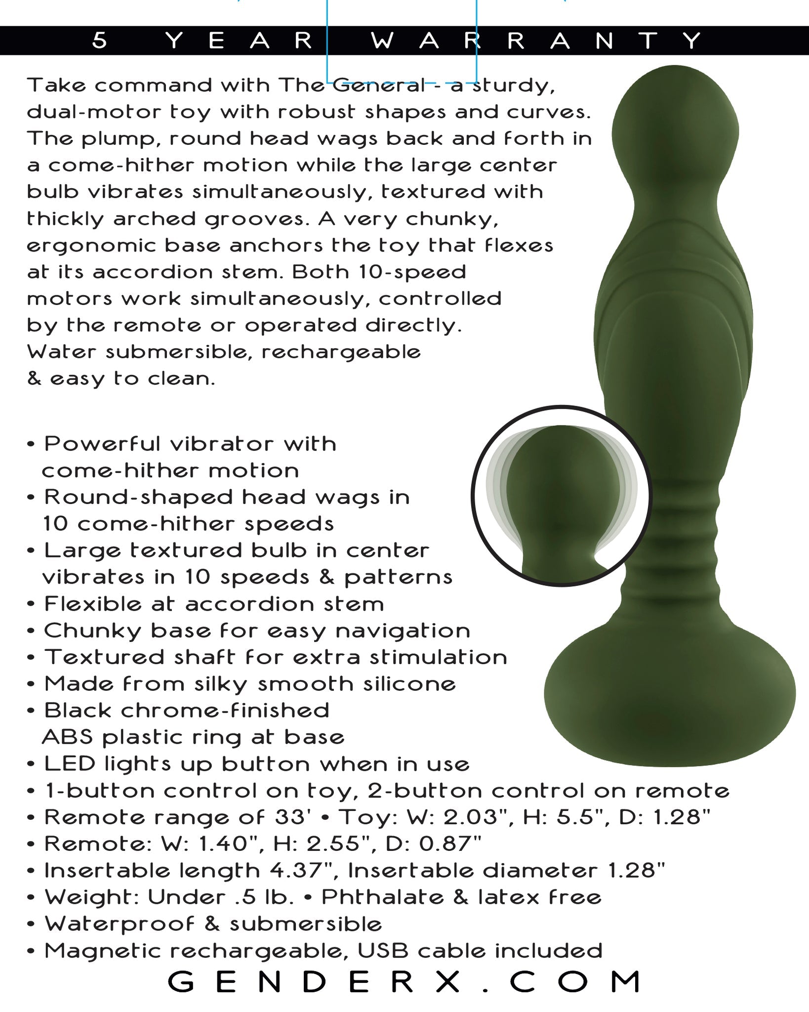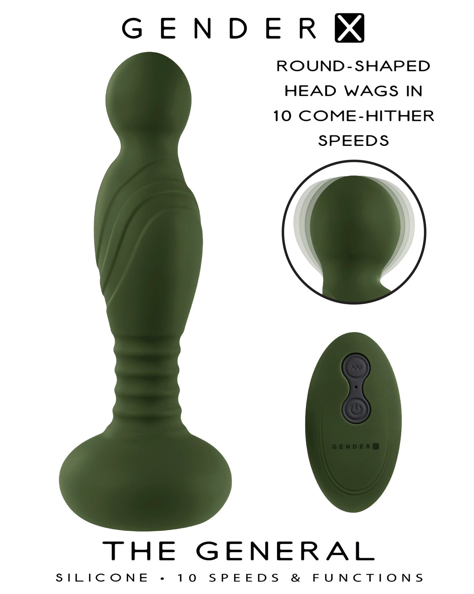 Gender X The General Round Shaped Head Wags and 10 Come Hither Speeds Prostate Massager from Evolved Novelties. Take command with The General Vibrator a sturdy, dual motor toy with robust shapes and curves. The plump, round head wags back and forth in a come hither motion while the large center bulb vibrates simultaneously, textured with thickly arched grooves. A very chunky, ergonomic base anchors the toy that flexes at its accordion stem. Both 10 speed motors work simultaneously, controlled by the remote or operated directly. Water submersible, rechargeable and easy to clean.