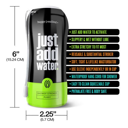 Happy Ending :) Just Add Water Stroker Pussy from Global Novelties. Just add water to activate, slippery and wet without lube and extra stretchy to fit most. Reusable and substantial stroker that is soft, tight and a lifelike masturbator, that can be used independently or in a cup. Size 6 inches in length. Waterproof hang cord for the shower. Easy to use and easy to clean. 3 styles: pussy, ass and mouth. Each sold separately. Categories: Male Masturbators, Sex Toys for Men, Masturbators, Pussy. 2023.