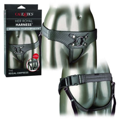 Her Royal Harness The Regal Empress Pewter from California Exotic Novelties. Prepare yourself for indulgent pleasure and premium probe play truly fit for royalty with The Regal Empress. The Her Royal Harness designer Vegan Leather, quick buckle waist enclosure and plushy Velvet lining give you the ultimate control over comfort. The Snap in Ring System allows 3 different rings to be interchanged to accommodate any size of probe, stimulator or plug. The totally Crotchless design lets you surrender yourself to your most erotic fantasies and dive deep into pleasure. This fashion forward Fetish Harness adjusts to fit up to a 64 inches waist. Materials: PVC Plastic, Polyester, Iron.