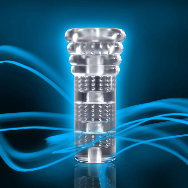 M For Men Soft and Wet All Nighter Clear Stroker from Blush Novelties. The M for Men All Nighter is loaded with fun! This stroker is self lubricating. Add a little water or saliva, and everything gets slippery. It also glows blue in the dark making it easy to see at night. The All Nighter has a soft erotic feel for sensational stroking and a ribbed inside for pressure point massage and pleasure. It's multiple chambers of unique textures will send you over the edge. Super soft and open ended the All Nighter will fit any size shaft. Made of ultra soft X5 Plus, it is free of phthalates, fragrances, paraffins and latex. As with all products and/or materials at Blush it has been 3rd party lab tested to meet or exceed REACH and Prop65 safety compliance directives. It's your body. Be mindful of what you put in it. Self lubricating properties are temporary. It will last up to 12 uses. To clean, wash with soap and water. Pat dry and allow to air dry before storing. You can start using water based, silicone or hybrid lubricants after self lubricating properties begin to diminish. Refresh it with our Blush Toy Renewal Powder when product is clean and dry. The M for Men All Nighter is loaded with fun! The All Nighter has a soft erotic feel for sensational stroking and a ribbed inside for pressure point massage and pleasure. Super soft and flexible, the All Nighter will fit any size shaft. Made of Thermoplastic Elastomers TPE. It is free of phthalates, fragrances, paraffins and latex. As with all products and/or materials at Blush it has been 3rd party lab tested to meet or exceed REACH and Prop 65 safety compliance directives. It is your body. Be mindful of what you put in it.