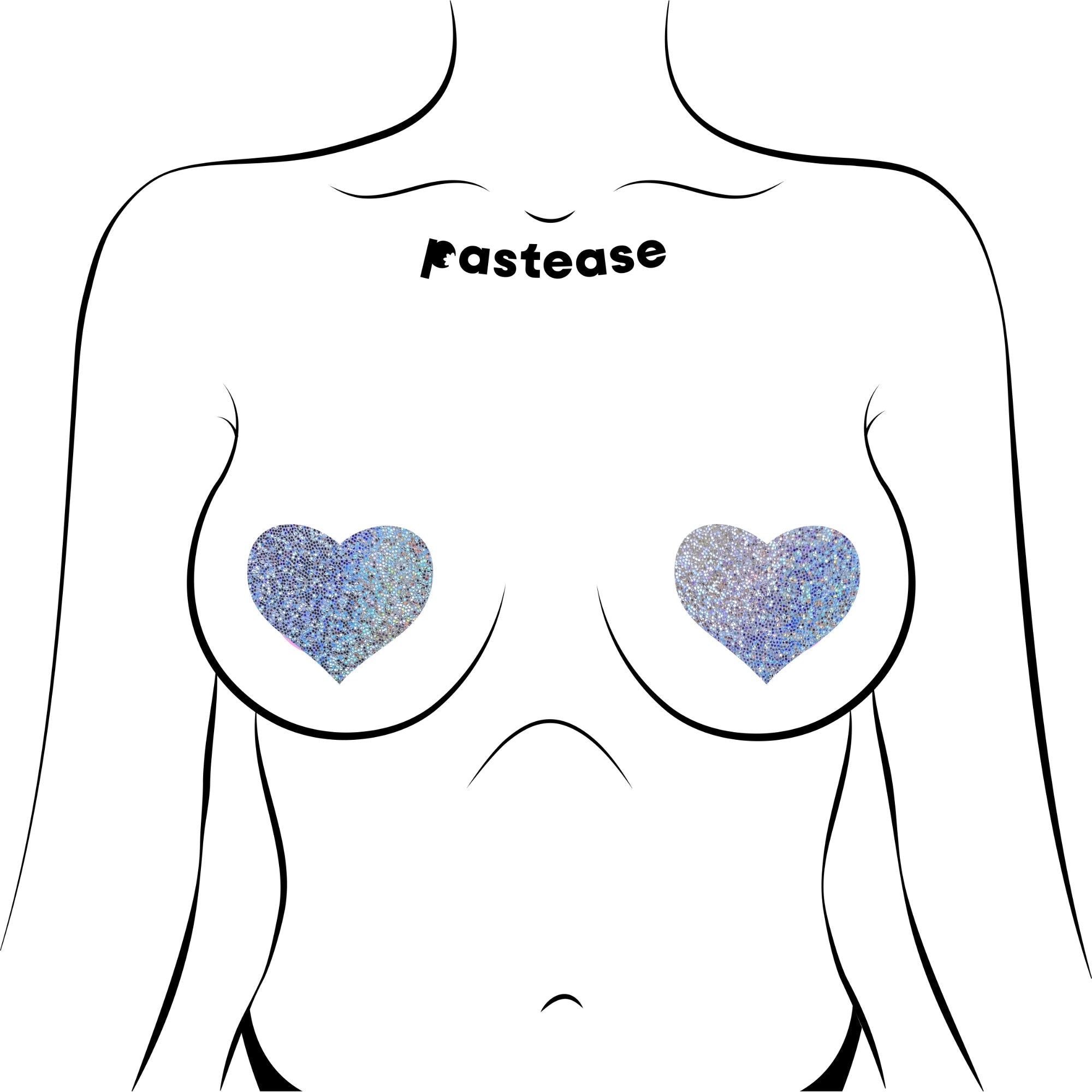 Pastease Hearts Silver Glitter Pasties. Durable no mess glitter pleather material that forms to curves and resists wrinkling over hardening nipples. Just peel and stick on clean, dry skin. All Pastease feature latex free, medical grade, waterproof adhesive that stay securely in place for as long as you like and until they are gently removed. Conceal or reveal with Pastease Nipple Pasties when worn with a sexy outfit, daring bikini, sheer top, revealing dress, Hefty bag, body lotion, crazy costume, party theme or nothing at all! Dimensions 3 inches by 2.5 inches. Coverage diameter 1.8 inches. Pastease are the fun maker that brings out your inner tease! Hand made in the USA. Serious about sexy fun freedom! Medical grade. Waterproof. Latex free, skin safe adhesive. Categories: Lingerie, Clothing, Valentine's Day, Nipple Play, Pasties, Accessories. Restricted, Amazon Restricted. Primary image package. How to apply pasties image. 2023-2024 Catalog.