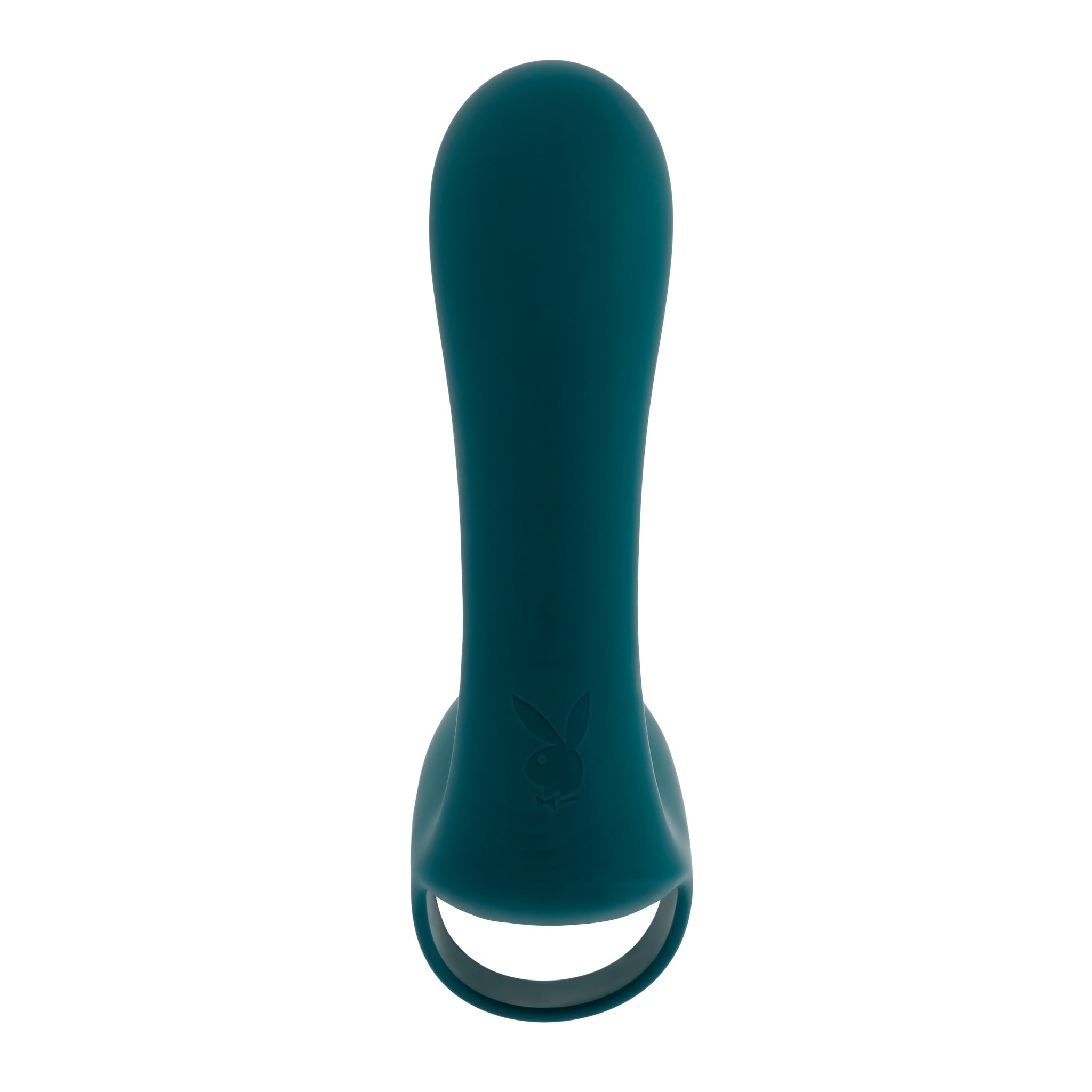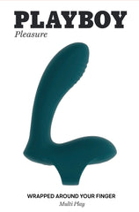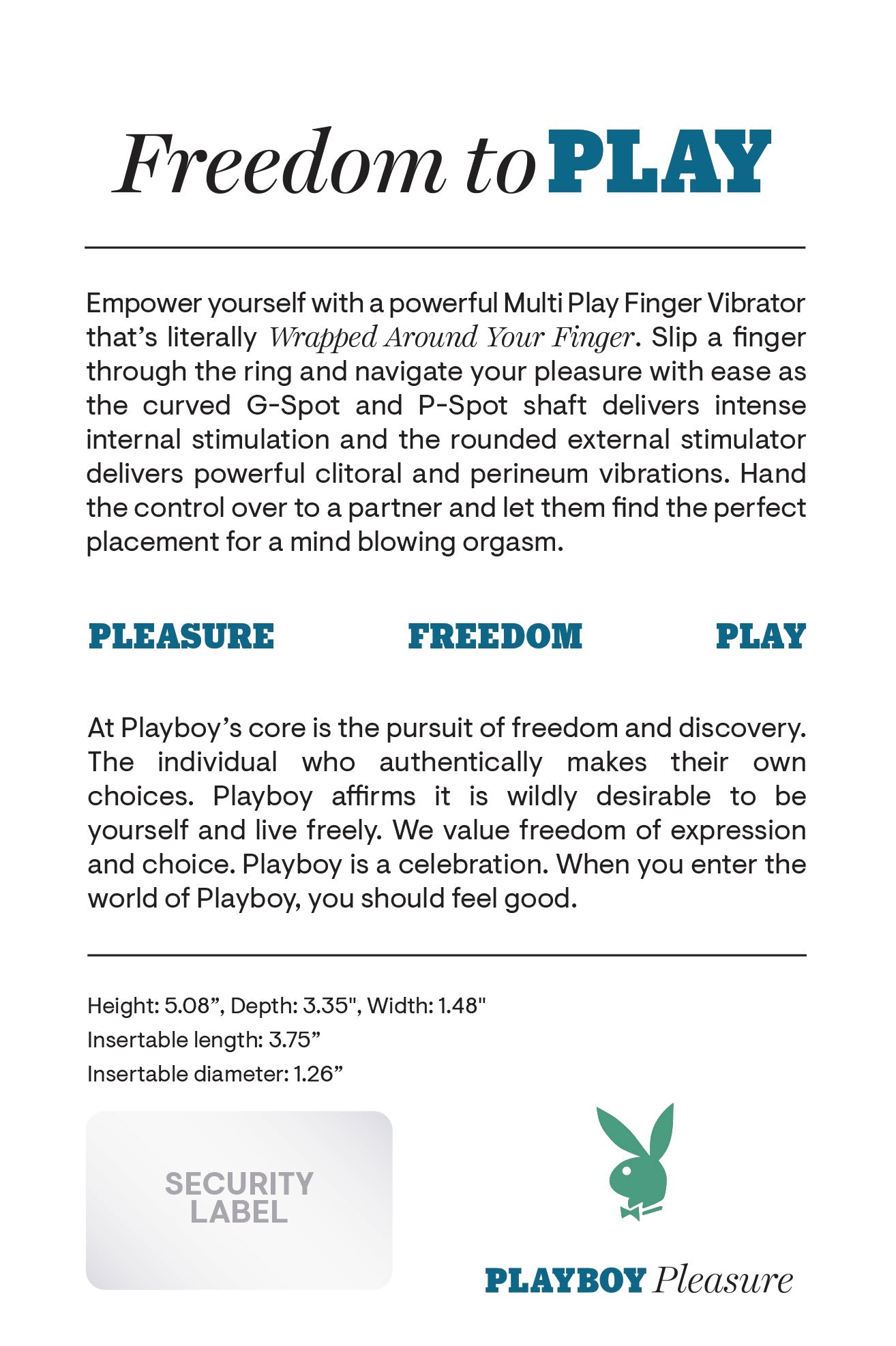 Playboy Wrapped Around Your Finger Blue Vibrator from Evolved Novelties. Freedom to Play: empower yourself with a powerful Multi Play Finger Vibrator that is literally Wrapped Around Your Finger. Slip a finger through the ring and navigate your pleasure with ease as the curved G-Spot and P-Spot shaft delivers intense internal stimulation and the rounded external stimulator delivers powerful clitoral and perineum vibrations. Hand the control over to a partner and let them find the perfect placement for a mind blowing orgasm. Panel details play with me key feature: finger ring for navigation, Targeted Multi Play, G-Spot and P-Spot vibrations. Vibration: 9 vibrating speeds and rhythms, 2 motors controlled together. Material: body safe Phthalate and Latex free Silicone