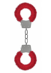 Ouch Pleasure Handcuffs Furry Red. Play around and lock up your lover with these great and naughty Pleasure Handcuffs. The locking mechanism has a quick release button in case you lose both keys. Materials Metal, Faux Fur. Color Red.