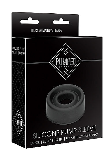 Pumped Pump Sleeve Large Black from Shots Toys. A super soft and stretchy silicone sleeve designed to maximize comfort and quickly and effectively create an airtight vacuum on Pumped penis cylinders. Warning: please read product manual before using any type of vacuum pump or constriction ring. Stop using the devices immediately if you experience any pain or discomfort. Dimensions package 6.1 inches by 3.54 inches by 1.38 inches. Weight package 2.12 ounces. Product dimensions 2.76 inches by 2.76 inches by 1.18 inches. Product weight 1.02 ounces. Product diameter 2.76 inches. Inner diameter 2.52 inches. Waterproof. Phthalate free. Materials Silicone.