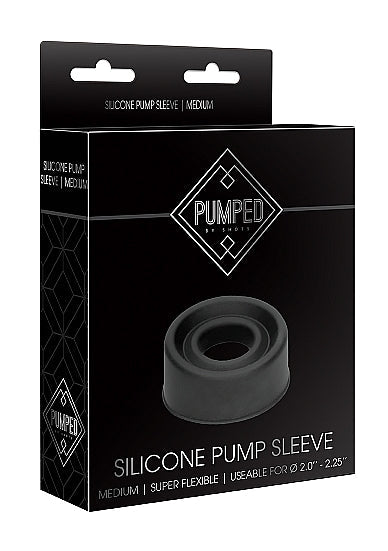 Pumped Silicone Pump Sleeve Medium Black from Shots Toys. A super soft and stretchy silicone sleeve designed to maximize comfort and quickly and effectively create an airtight vacuum on Pumped penis cylinders. Warning: please read product manual before using any type of vacuum pump or constriction ring. Stop using the devices immediately if you experience any pain or discomfort. Dimensions package 6.1 inches by 3.54 inches by 1.38 inches. Weight package 1.76 ounces. Product dimensions 2.56 inches by 2.56 inches by 1.18 inches. Product weight 0.71 ounce. Product diameter 2.56 inches. Inner diameter 2.28 inches. Phthalate free materials Silicone.