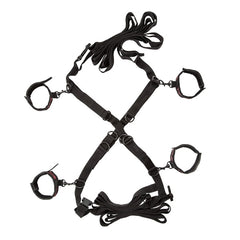 Scandal Over the Bed Cross from California Exotic Novelties. Strap your lover firmly to the bed and carry out their deepest desires with the Scandal Over the Bed Cross. The strong straps are fully adjustable to fit every size bed. The universal clasps and rings feature a swivel design that makes changing positions in the heat of the moment take a matter of seconds. As the dominant, you will love the sight of your partner splayed out across the bed, totally immobilized by these unbreakable restraints. Your submissive will only be able to watch and moan with desire as you kiss, tease, and caress them to the point of ecstasy. As the submissive, you will love the rush of placing full trust in your partner to do exactly what they please and everything that drives you wild. The soft, plushy wrist and ankle cuffs will keep you comfortably bound, no matter how hard you twist and pull on your restraints. The cross like design keeps you totally exposed to the admiring gaze and lustful hands of your lover for ultimate pleasure. Your dominant can tighten the straps to spread your legs as far apart as you dare to bare all and give them access to all of your most sensitive spots. An incredibly sexy foray into the world of roleplaying and promises a unique and naughty evening of play for both dominant and submissive style bed restraints. Includes totally adjustable and detachable universal wrist and ankle cuffs. Soft and plushy on one side,with designer fabric on the other. Universal clasps and D-rings with swivel design. Safe and pure for body and pleasure made using phthalate free materials: Polyester fabric, lining, Velcro, Polypropylene PP straps, buckles, Acrylic dowels, Nickel free Alloy clasps, Nickel free iron D-rings. Adjustable to fit mattresses up to Cal King size. Straps adjust up to 180 inches. Cuffs adjusts up to 14.5 inches. Bulk weight 16.1 ounces. Categories: Bondage, Fetish, Kink, Sex Swings, Machines, Erotic Furniture, Bondage Restraints, Sensual Kits. 2023.