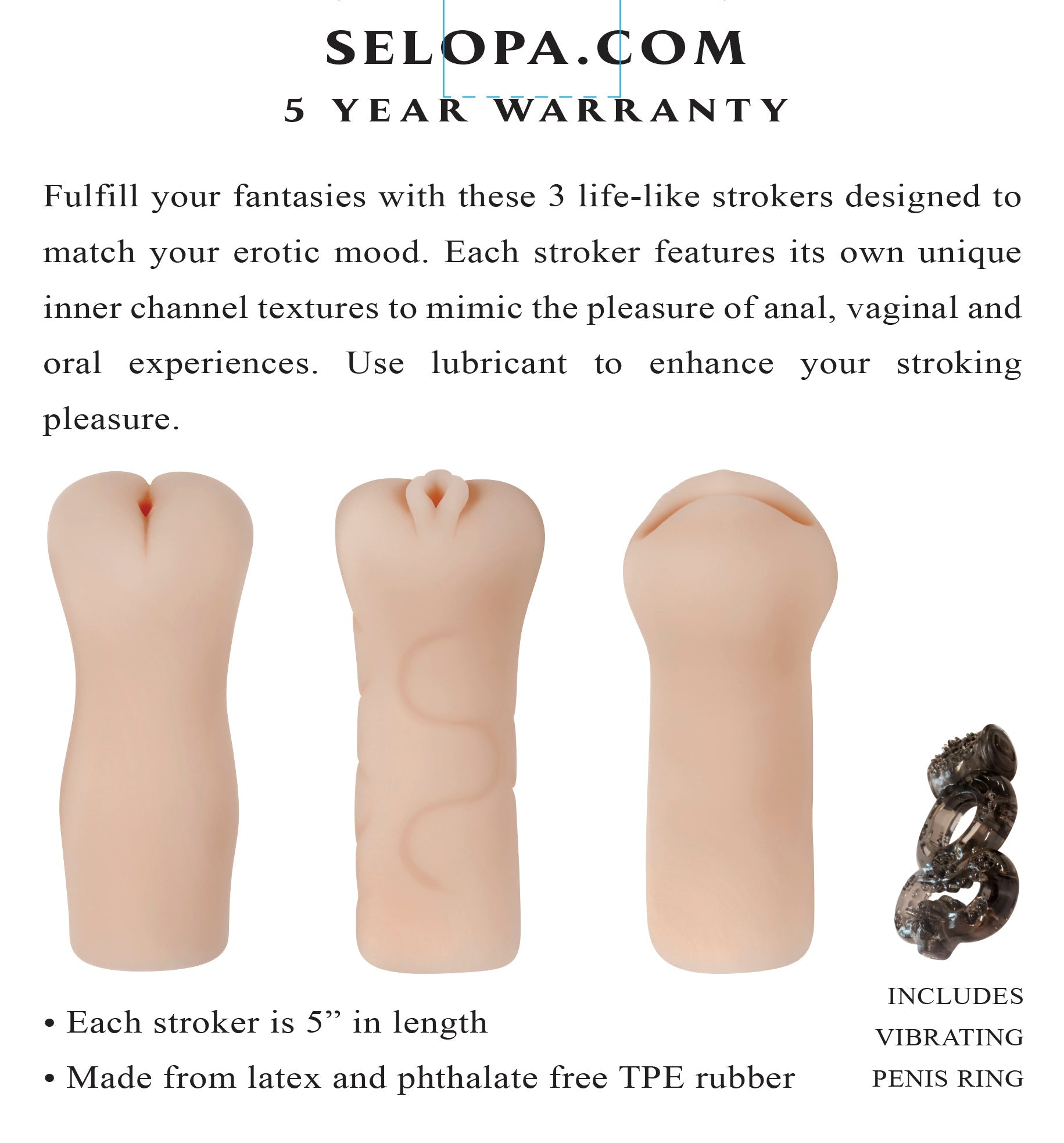 Selopa Party Pack Light Skin Tone 3 different strokers from Evolved Novelties. Fulfill your fantasies with these 3 life like strokers designed to match your erotic mood. Each stroker features its own unique inner channel textures to mimic the pleasure of anal, vaginal and oral experiences. Use a water lubricant to enhance your stroking pleasure.