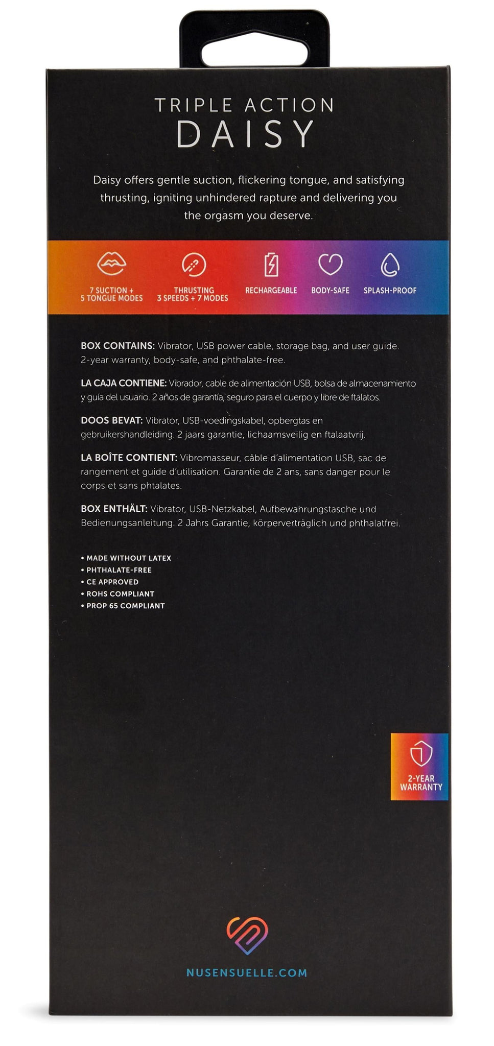 Daisy Triple Action Vibe with Suction plus Flickering Tongue. Nu Sensuelle took their wildly popular Trinitii and bumped up the erotic potential with the addition of thrusting to simulate a realistic and satisfying sensation. With three speeds and seven modes, the imaginative thrusting component replicates the natural movements of a partner. Daisy also offers seven gentle suction speeds and five flickering tongue modes that can be layered to simulate oral play. The spirited multi-play functionality of suction, flickering tongue, and thrusting delivers the orgasm you deserve. Categories: Vibrators, Clitoral Stimulator, Tongue Vibrators, Sex Toys for Women. 2024.