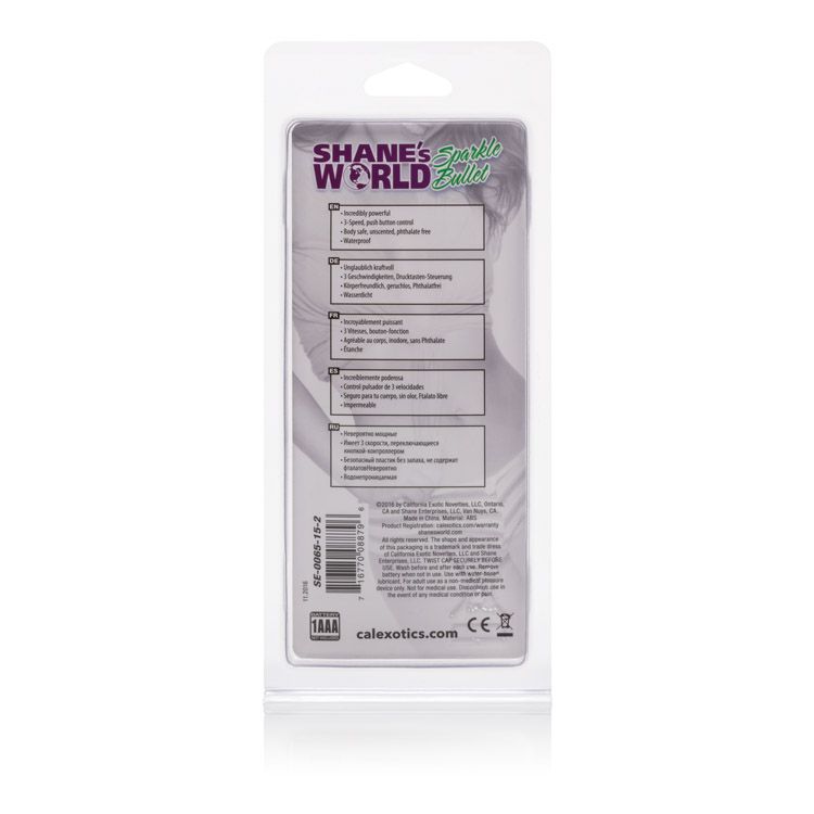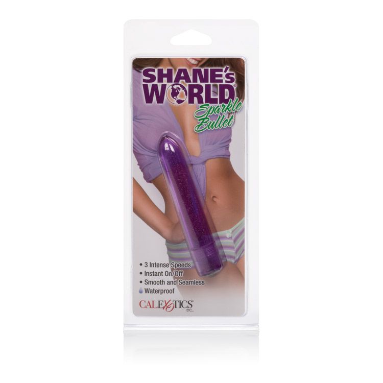 Shane's World Sparkle Bullet Vibrator Purple. Designed for the perfect discretion no matter where you travel, this beautiful compact product is ready to go whenever and wherever you are. Enjoy the ultimate in pleasure. Designed for easy use, you will find operation a snap even on the darkest night. Frustration free and perfect for pleasure, just one push brings intense stimulation your way. Good things really do come in small packages! The Shane’s World Sparkle Bullet is a sure thing when it comes to the bedroom. Designed to be totally simple and totally discreet, this amazing 3 speed massager is the perfect starter product for first time users, or a handy little carry on device for weekends away. Uncomplicated and free from any overly intricate features, this toy is designed with a single button that offers one touch activation. This intimate massager has a fun and spunky glitter finish that makes it shine and sparkle in a tantalizing and alluring fashion. The seamless ABS Plastic material is completely safe anywhere on the body. With a 100% waterproof design, you can have stimulating fun in the tub or the shower too. This little naughty toy is perfect for use alone or with a partner. Do not forget to enhance your experience with our Universal Lube.