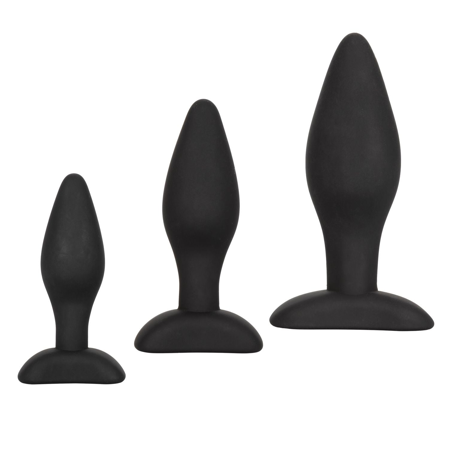 Silicone Anal Exerciser Kit Black from California Exotic Novelties. Open the door of thrilling anal sensation with the Silicone Anal Exerciser Kit. This kinky kit includes a set of 3 graduated Anal Plugs let you safely and comfortably increase passionate anal stimulation. To enjoy everything the exhilarating world of anal play has to offer, training is in order to ensure total safety and satisfaction. Each Anal Probe in our kit gradually increases in length and girth for superb pleasure at any level of pleasure play. While each increase of your training expands your horizons, use the convenient flange base for steamy stimulation, effortless insertion and gentle removal. The flexible probes are made from a smooth, seamless Satin Finish Silicone. This body safe material is unscented and phthalate free to keep your most sensitive spots happy and healthy.
