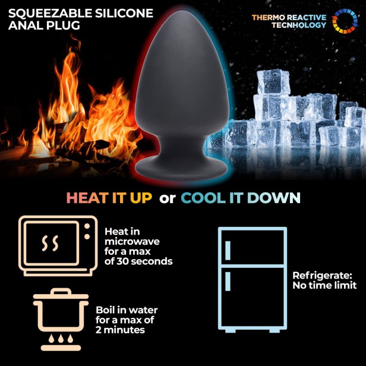 Squeeze It Silexpan Anal Plug Small Black from XR Brands. Available in 3 sizes, this squeezable, bendable butt plug makes insertion easy and fun! This state of the art anal accessory is ultra flexible so that it can conform to your demands. Enjoy the classic spade shape with its wide bulb, or squish it into a more tapered design that slides in with ease. Made with Thermo-Reactive Technology, it can be cooled down in a refrigerator until you are ready to use it, making it chill and hard, or it can be heated in a microwave or boiling water to make it warm and comfortably pliable. Suction down the base to a smooth surface for a hands free penetration. The premium Silicone material is non-porous and phthalate free, but not compatible with Silicone lubricants. Clean after use with mild soap or toy cleaner. Made with a patented revolutionary formula for a realistic feel. Measurements: 3.5 inches in total length, 3.2 inches insertion length, 2 inches at widest diameter, .9 inch in diameter at narrowest diameter, not manipulated. Material: Silexpan Silicone. Color Black. Categories: Anal Toys, Small and Medium Butt Plugs. 2023.