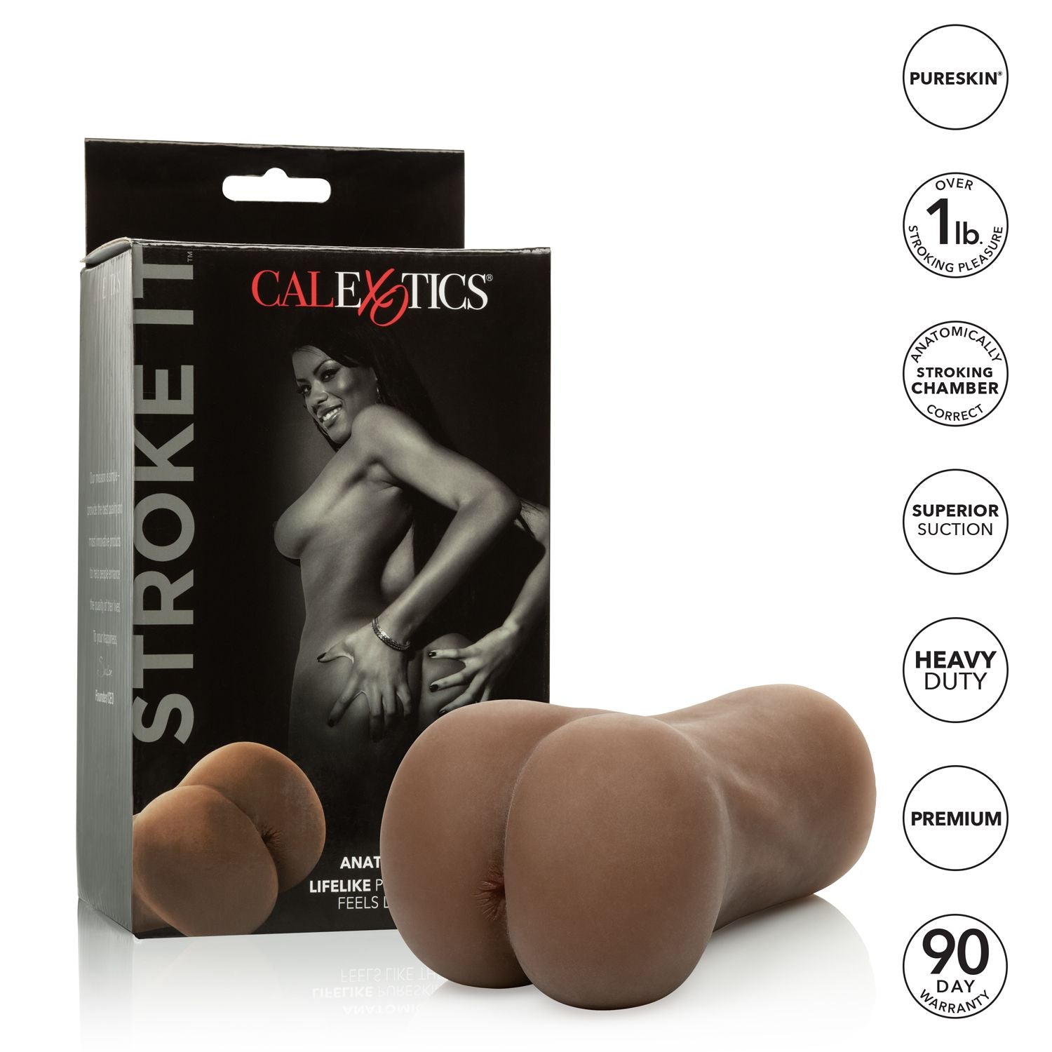 Stroke It Ass Brown Dark Skin Tone Masturbator from California Exotic Noveltes. The Stroke It collection brings you the Ass stroking sleeve, made to thrill with every ultra tight Stroke. Dive deep into over 1 pound of heavy duty stroking pleasure with erotically plump cheeks and an ultra tight, closed ended chamber. Our plump Stroker Sleeve is great for anyone wanting a little extra oomph in their solo play; Over 1 pound of Pure Skin material make for the truly heavy duty, pounding pleasure you have been craving. The indulgent Stroker has a textured, anatomically correct chamber for explosive stimulation. Use this close ended Sleeve with ample lubrication for powerful suction worthy of your naughtiest fantasies. Pure Skin Thermoplastic Rubber TPR is a super soft, ultra stretchy material with a unique, life like feel delivering pure satisfaction in every stroke. This durable Sleeve is easy to use, easy to clean and requires no special care. Prior to and after each use, wash sleeve internally and externally with warm water and soap, then disinfect with the Universal Toy Cleaner. Color Brown, Dark Tone. Materials: Thermoplastic Rubber TPR.