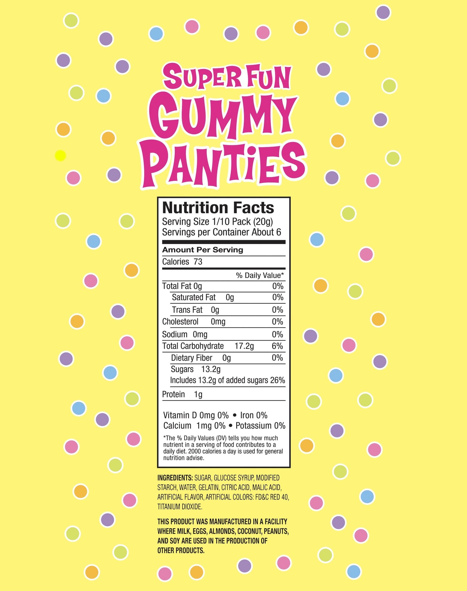 Super Fun Gummy Bikini Set from Candyprints. Get ready to turn heads with the Super Fun Gummy Bikini the ultimate combination of fun and flavor! You will feel deliciously fabulous in this heart shaped bikini with adjustable tie straps, and it is a perfect fit for most sizes! Do not settle for ordinary swimwear or lingerie when you can have a mouth watering treat that will tempt, tease, and satisfy all your cravings! Become the dessert. Categories: Party Games, Gifts, Supplies, Adult Candy and Erotic Foods, Lingerie, Clothing, Bra Sets, Naughty Role Play. 2023.