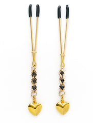 Tweezer Nipple Clamps with Heart Pendant from Spartacus Leather. Adjustable tweezer style nipple clamps with 2 heart pendants on the ends. Soft rubber tips. Adjust the clamps by sliding the metal rings up the tweezers from merely lovely decoration to pretty strong stimulation.
