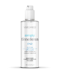 Wicked Timeless Aqua Jelle Lubricant 4 fluid ounces from Wicked Aqua. Simply Timeless lube is uniquely formulated to address the specific needs of individuals during the perimenopausal and menopausal stages and beyond. Each formula contains ingredients that can help alleviate dryness and promote a more comfortable and satisfying intimate experience. Each lube contains supportive ingredients like aloe, olive leaf extract, squalane, and Vitamin E. These supportive ingredients are what makes it different from the rest of the Simply line. Like all products under the Simply label, Timeless formulas are free from glycerin, parabens, and propylene glycol. Can also be used as a daily vaginal moisturizer. Directions: begin with a small amount of Simply Timeless lube to the desired area as needed. Reapply as necessary to maintain comfort and lubrication during intimate moments. Ingredients: Water, Sodium Hyaluronate, Aloe Barbadensis Leaf Juice, Squalane, Olea Europaea Olive Leaf Extract, Tocopherol Vitamin E, Stevia Rebaudiana Leaf/Stem Extract, Hydroxyethylcellulose, Cellulose gum, Sodium Chloride, Citric Acid, Sodium Benzoate, Potassium Sorbate. Simply Collection with clean ingredients: Wicked Sensual Care’s Simply line is a collection of water based and hybrid lubricants that are also glycerin and propylene glycol free. When you want a clean lube do it simply. Simply Timeless lube was specifically formulated to address the unique needs of those experiencing perimenopause and menopause, providing enhanced comfort and moisture to improve intimate experiences during all phases of life. Your journey through menopause is uniquely beautiful, a testament to resilience and evolving desires, but you are not alone in that journey. Categories: Lubricants, Water Based, Health and Beauty Aids. 2023.