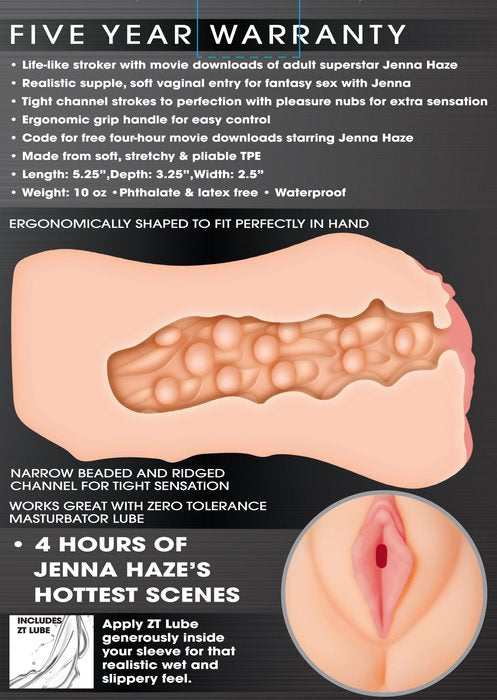 Zero Tolerance Toys Jenna Haze Movie Down Load with Realistic Vagina Stroker. Vagina Stroker Jenna Haze. Life like stroker with movie downloads of adult superstar Jenna Haze. Realistic supple, soft vaginal entry for fantasy sex with Jenna. Tight channel strokes to perfection with pleasure nubs for extra sensation. Ergonomic grip handle for easy control. Code for free four hour movie downloads starring Jenna Haze. Made from soft, stretchy and pliable Thermoplastic Elastomers TPE. Length: 5.25 inches, depth 3.25 inches, width 2.5 inches. Bulk weight 10 ounces. Phthalate free and latex free.