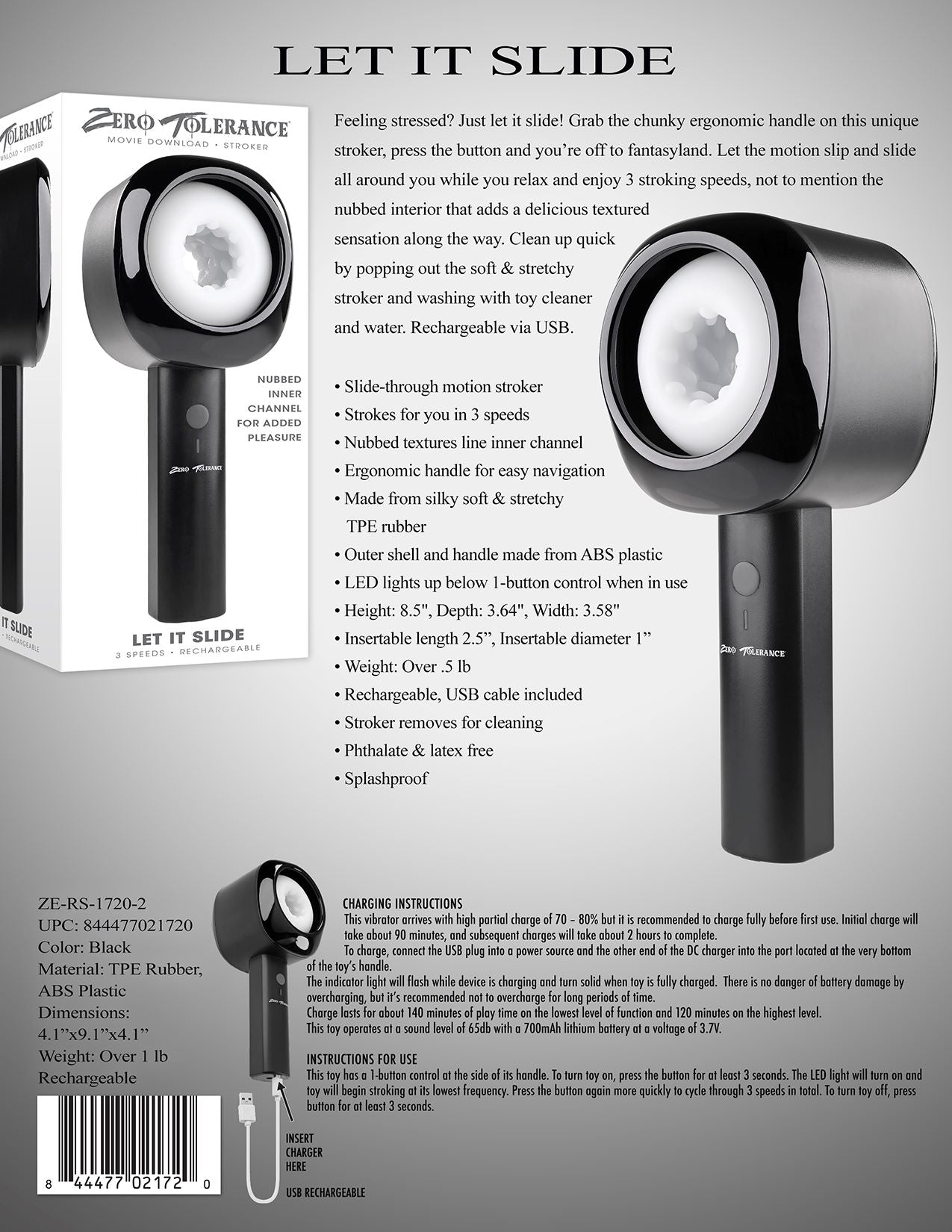 Zero Tolerance Toys Let It Slide Movie Download Stroker. Feeling stressed? Let It Slide. Grab this chunky ergonomic handle on this unique stroker, press the button and you are off to fantasy land. Let the motion slip and slide all around you while you relax and enjoy 3 stroking speeds. Not to mention the strokers interior adds a delicious texture a long the way. 3 speeds of vibration. Rechargeable via USB, cord included. Nubbed inner channel for added pleasure. Clean up by popping off attachment soft and stretchy stroker off. Washing with a toy cleaner and followed by a cool water rinse. Pat dry before storing. Rechargeable via a USB port. Made using the following materials body safe: ABS Plastic: Outer Shell, Stroker Case and Ergonomic Handle, Thermoplastic Elastomers TPE Stroker Sleeve. Battery type Lithium ion. Size total length 8.5 inches, 2.5 inches insertable. Sound level equal = to or less than <65dB. 5 years warranty. Categories: Solo Masturbators, Vibrators, Sex Toys for Men, Rechargeable Vibrators, Strokers, Male Masturbators. Please note the catalog page tells charging instructions and how to use Let It Slide Stroker. New Video. 2023.