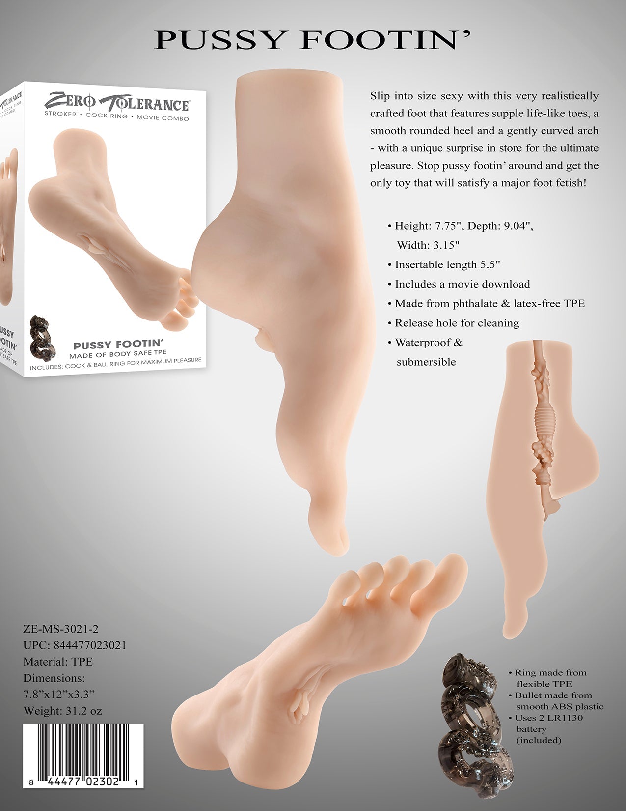 Zero Tolerance Pussy Footin Light Stroker, Cock Ring and Movie Combo from Evolved Novelties. Slip into size sexy with this very realistically crafted foot that features supple life like toes, a smooth rounded heel and a gently curved arch with a unique surprise in store for the ultimate pleasure. Stop pussy footing around and get the only sex toy that will satisfy a major foot fetish!