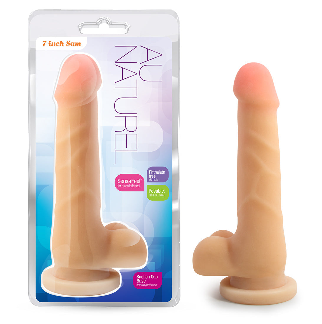 Au Natural 7 inches Beige Dildo. Get to know 7 inches Sam. He is the full package. His realistically sized veined shaft is fully pose able, so go ahead, bend him to your will! Angle him just right and enjoy the extra lifelike sensation of Sensa Feel, Blush Novelties dual density technology that is a perfect balance of firm and soft. 7 inches Sam is equipped with squeezable balls and a powerful suction cup so you can enjoy him from every direction. He is also harness compatible for a realistic experience for two. Sensa Feel is body safe, phthalate free and latex free for pure pleasure.