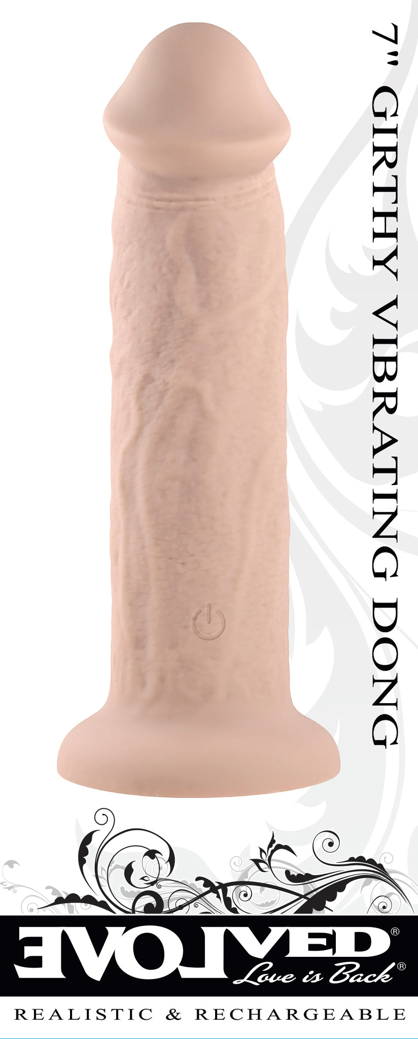 Evolved 7 inches Girthy Vibrating Dong Light Skin Tone. Beautifully crafted to look like the real thing, this girthy vibrating dildo has a defined tip with a satisfying thick crown ridge and realistic veins and textures. Control 10 speeds and patterns of vibration from gentle to intense with one simple button at the powerful suction cup base. Take your toy under water as it is completely submersible. Rechargeable, high grade Silicone. Easy to clean.