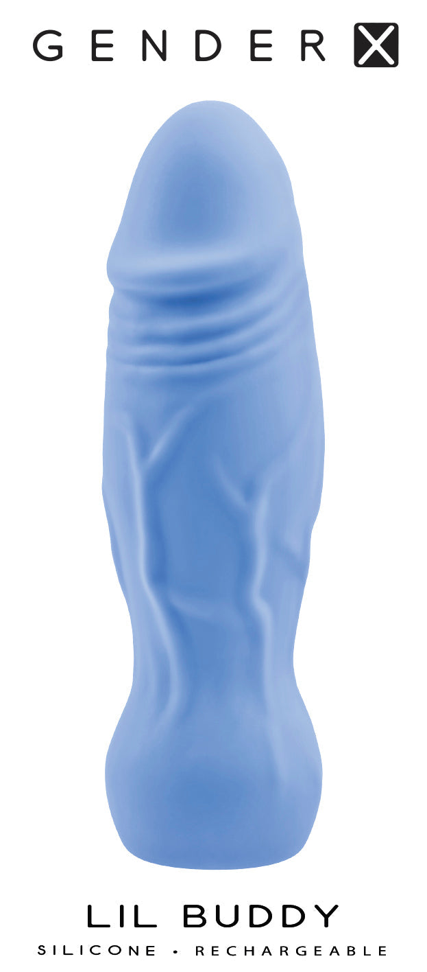 Gender X Lil Buddy Blue Realistic Vibrator from Evolved Novelties. This pocket sized Silicone Vibrator is crafted with lifelike textures including a penis crown tip and realistic veins. It is hand friendly design tapers to a chunky base with a 1 button control at the bottom that operates 11 vibrating speeds and patterns from mild to intense. Life like flexible textured vibrator. 11 vibrating speeds and patterns. Made from body safe materials that are both phthalate free and latex free Silicone. Waterproof vibrations. Submersible in water. USB rechargeable, cable included. Size height 4 inches by, depth 1.14 inches, width 1.14 inches. Insertable length 3 inches, insertable diameter 1.14 inches. User play time approximately 35 minutes to 50 minutes. Speed of the vibrator determines the time on lower speed lesser time. Charging time 90 minutes. Battery is made from Lithium Ion. 5 years warranty. Categories: Vibrators, Eco-Friendly Sex Toys, Rechargeable Vibrators, Dildos, Dongs, Realistic Vibrators, Realistic Small, Medium Vibrator, Dildos, Dongs Realistic. 2023.