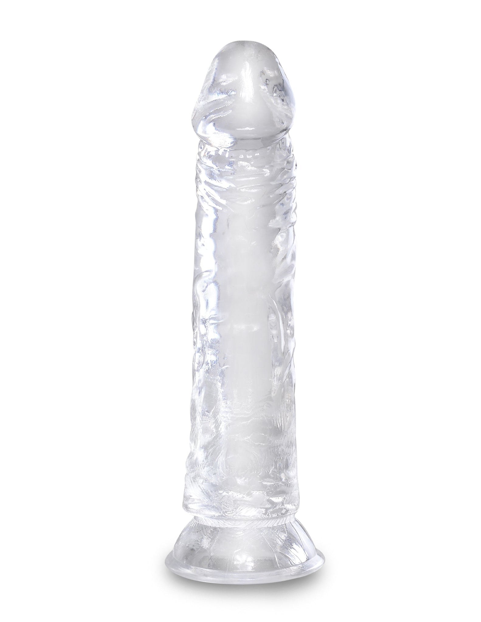 King Cock Clear 8 inches Cock Realistic Dildo from Pipedream Products. Clearly the best! Created to heighten your pleasure experience, this specially crafted formula is virtually odorless, non-sticky, and easy to clean. King Cock Clear combines a translucent dildo with a realistic cock design. The luminous clarity and life like form will fulfill all your fantasies! With its flexible shaft, detailed veins, and defined head, King Cock Clear will engage your senses visually and physically. The powerful suction cup base sticks to nearly any flat surface and makes every dildo harness compatible. See the innovation. An incredibly pure, translucent material. Feel the realism. A life like design with every vein, shaft and head carefully hand crafted. Enjoy the action. A powerful suction cup base sticks to nearly any flat surface. Experience the advantages. Effectively harness compatible with the sturdy suction cup detail. Bulk weight 8.5 ounces. Package depth 3.5 inches, width 5.5 inches, height 14.5 inches. Packaged weight 12.5 ounces.