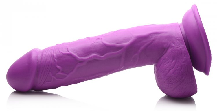Pop Peckers 8.25 inches Dildo with Balls Purple from XR Brands. This popping colorful dildo is ready to be popped inside for your pleasure! Its veiny shaft and realistic balls are perfect for fantasy play! The suction cup base allows you to enjoy this toy hands free by placing it firmly on any flat surface and riding it to ecstasy! For play with a partner, this sexy dildo is also harness compatible for strap on play! Use with plenty of water based or silicone based lubricant. Do not use oil based lube! Made of phthalate free PVC rubber, this dildo is safe for internal use. After play, wash with warm water and soap and store in a cool, dry place. Measurements: overall length with suction cup 9 inches, overall length without suction cup 8.25 inches, insertion length 6.8 inches, widest insertion diameter: 1.9 inches. Materials non-phthalate PVC. Color Purple. Key features Poppin Color! Enjoy the eye popping color of this unique and colorful dildo! Heavy, Solid Rubber: The PVC rubber is phthalate free and has a firm feel and good weight to it. Use only with Silicone or Water Based Lubricants. Suction cup base. The suction cup base is great for hands free pleasure. For use with a partner, this dildo is also harness compatible and can be used as a strap on! XR Brands - Pop Peckers. Categories: Dildos, Dongs, Realistic Large Dildos, Dildos and Dongs Realistic. 2023.
