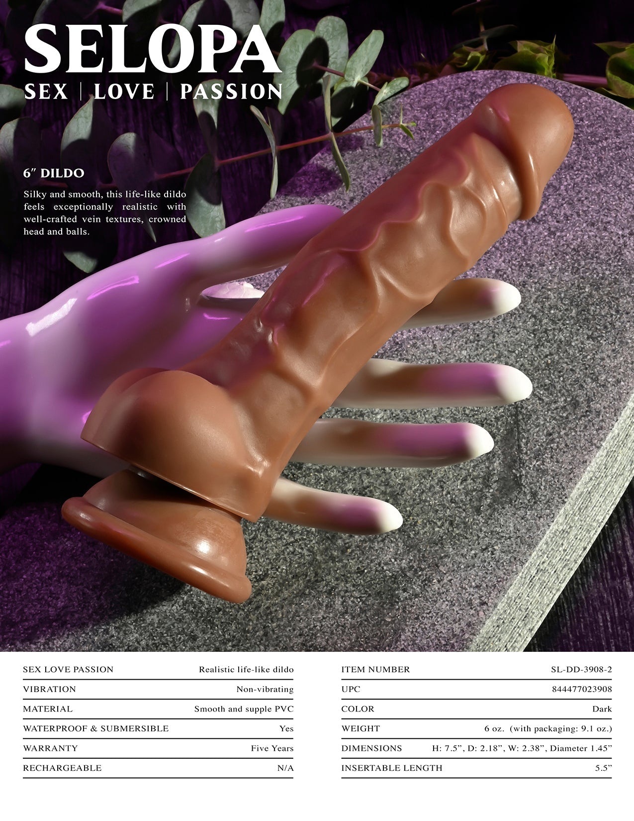 Selopa 6 inches Dildo Dark Skin Brown from Evolved Novelties. Silky and smooth, this life like dildo feels exceptionally realistic with well crafted vein textures, crowned head and balls.