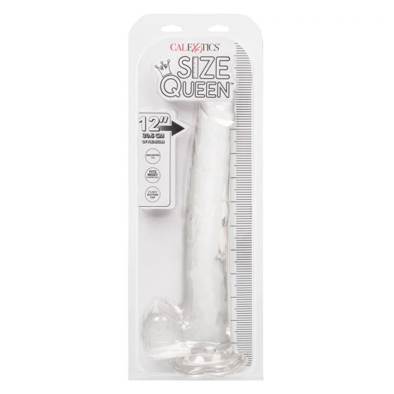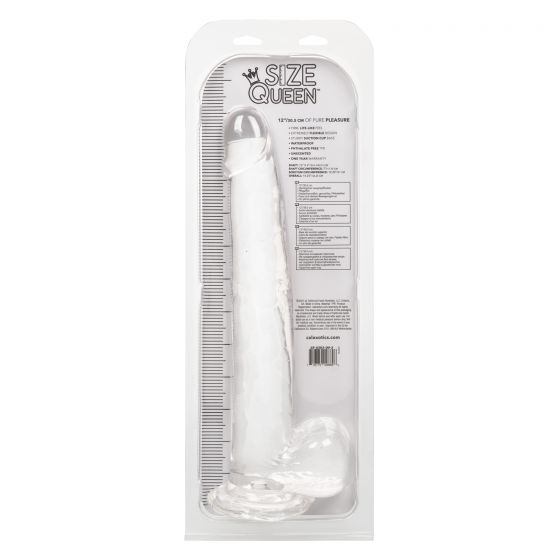 Size Queen 12 inches Clear Dildo from California Exotic Novelties. For the Size Queen who knows exactly what they want, the 12 inches Size Queen is a full 12 inches long, with a 14.25 inches over all size of life like pleasure. The 12 inches dong is firm yet flexible feel and will ensure you receive exactly what you are looking for, including a realistic head and veins. With a sturdy, suction cup base you can have your play on a chair, in the shower or anywhere you desire that has a firm and non-porous surface. Stop settling for the small stuff. Go after what you really want the extra large, 12 inches Size Queen. It is sure to hit the spot. The hand washable design ensures you endless hours of pleasure. Compatible with nearly all harnesses, the Size Queen 12 inches will fully deliver an erotic, life like experience you will not forget.