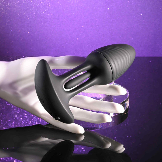 Cue the Rim Shot! You’re sure to find the fun with this vibrating plug that has one very special secret. Inside the plug’s shaft is a flicking flapper that swings from side to side to tickle and tease in up to 10 speeds and rhythms! The chunky plug itself is tapered to a rounded tip for easy entry and textured with ridges for added sensation. The flapper hangs below the plug to work its pleasurable magic before the wide safety base acts as a sexy stopper, finishing out the full experience. Discover the extraordinary feeling of a flicking plug – even under water as it’s completely submersible – not to mention long distance hands-free with the 100’ range remote! Panel Details Play with me (key feature): Vibrating, Flicking Plug Vibration: 10 vibration and flicking speeds & rhythms Material: Body-safe Phthalate & Latex free Silicone Waterproof & Submersible: Yes Warranty: Five years Rechargeable: USB cable included Size Specs Height: 5.65”, Depth: 1.77”, Width: 3.19” Insertable Length: 4.5”, Diameter: 1.77” Remote: Height: 3.25”, Depth: 1.08”, Width: 1.24”